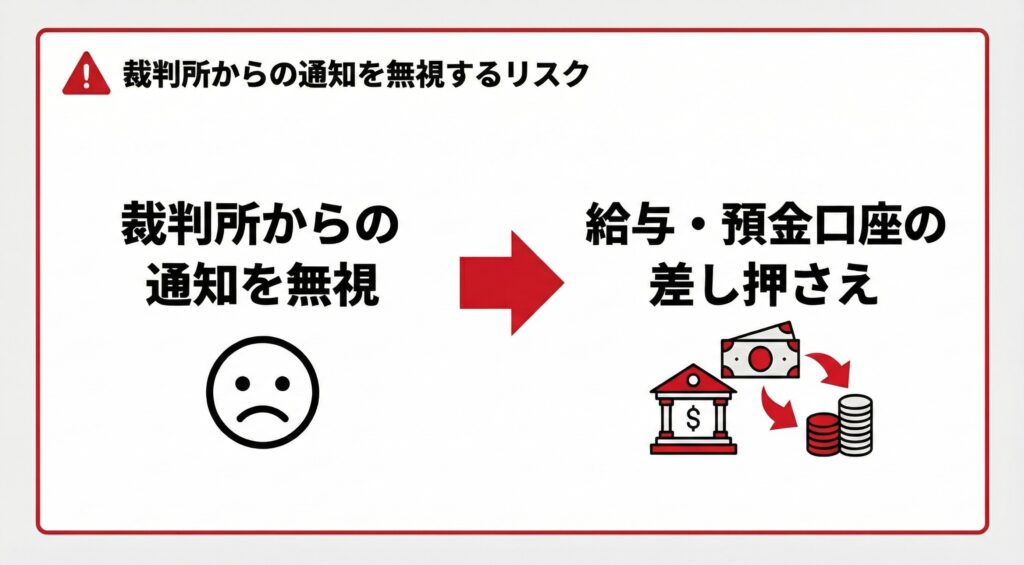 裁判所からの書類を放置すると不利な結果(仮に相手方の主張が認められれば差押等)が生じる可能性があるため、受領したら早めに専門家に相談してください。ある日突然、給料の一部が振り込まれなくなるといった事態になりかねません。