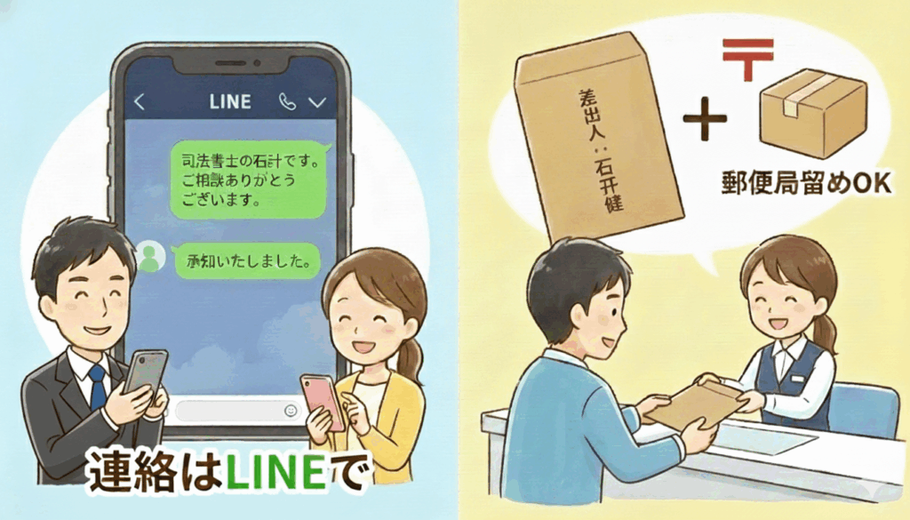 そこで当事務所では、ご自宅へ書類をお送りする必要がある場合、差出人の欄を「司法書士かなた法務事務所」ではなく、司法書士の「個人名」でお送りするなどの配慮をしています。さらに、ご希望があれば、ご自宅には一切郵送せず、お近くの郵便局で受け取れる「郵便局留め」で対応することも可能です。ここまで徹底することで、郵送物から手続きが知られるリスクを限りなくゼロに近づけます。