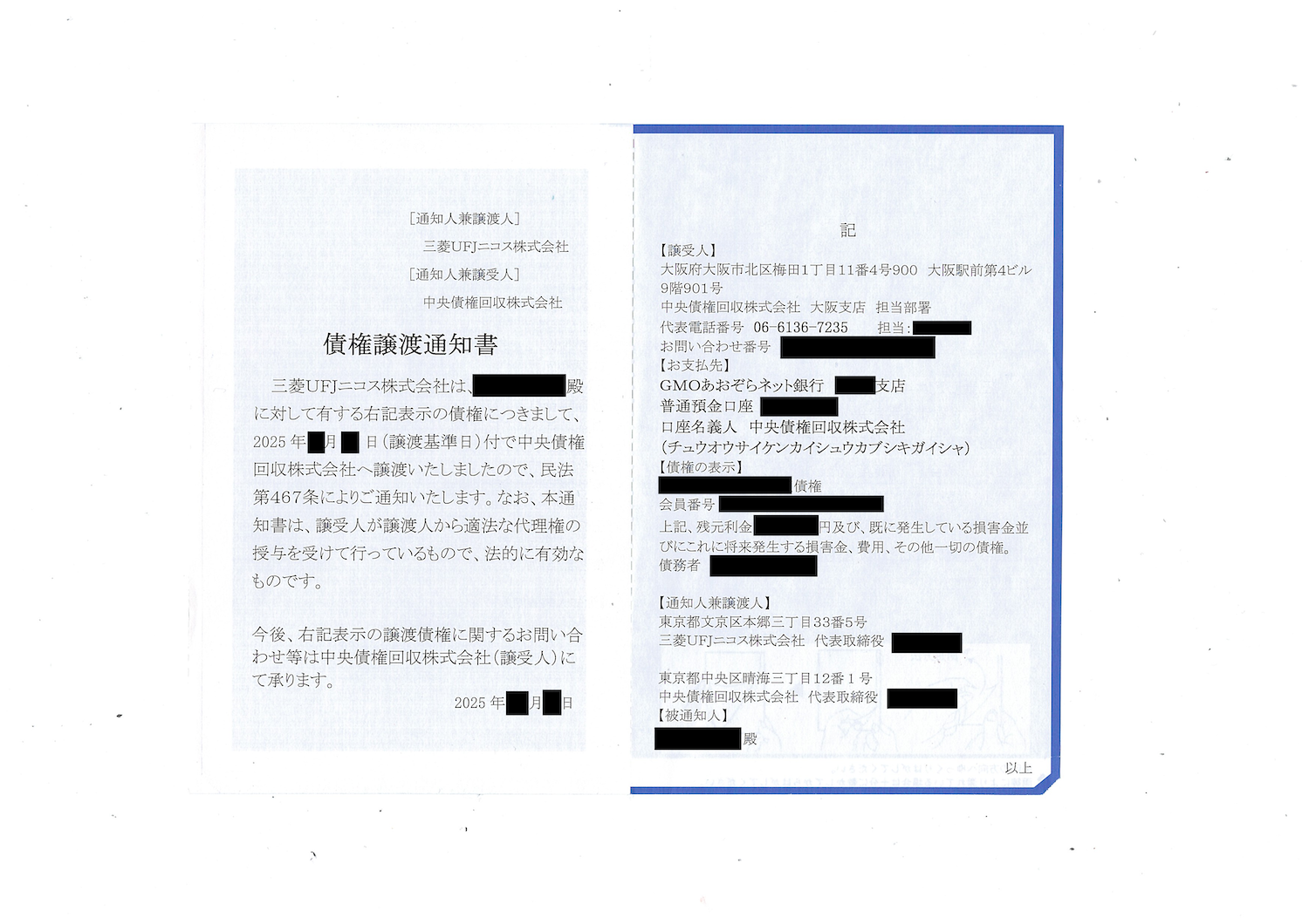 実際に届いた中央債権回収の「債権譲渡通知書」
