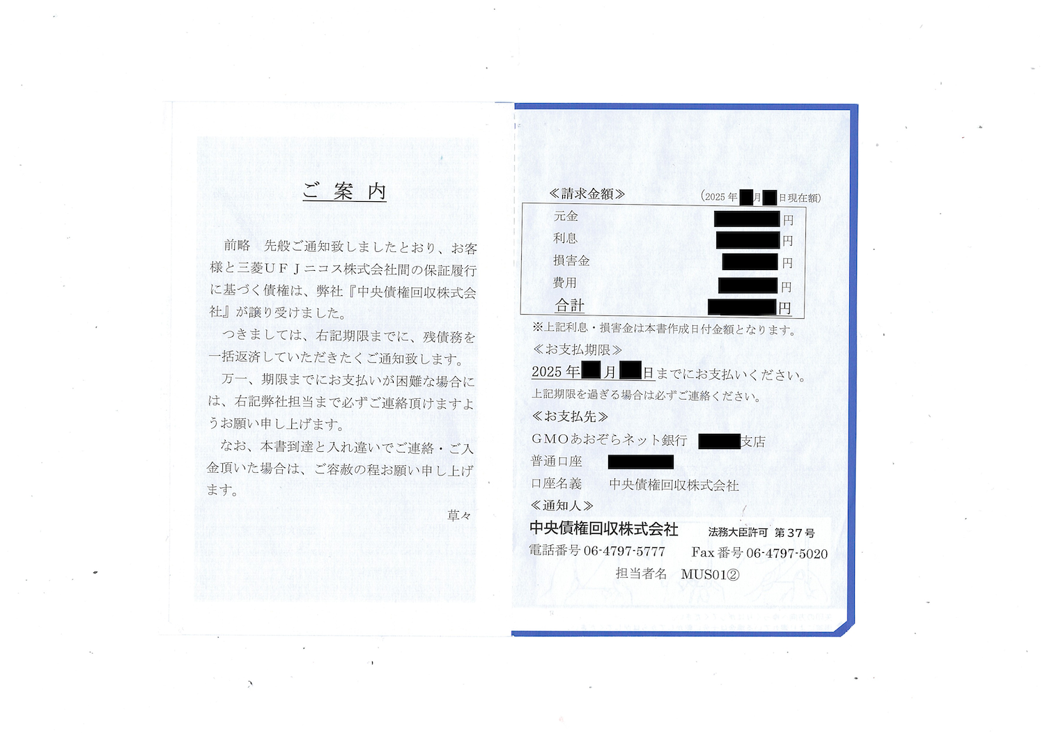 実際に届いた中央債権回収からの「ご案内」